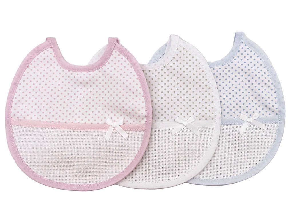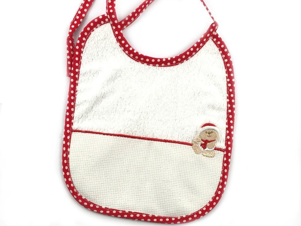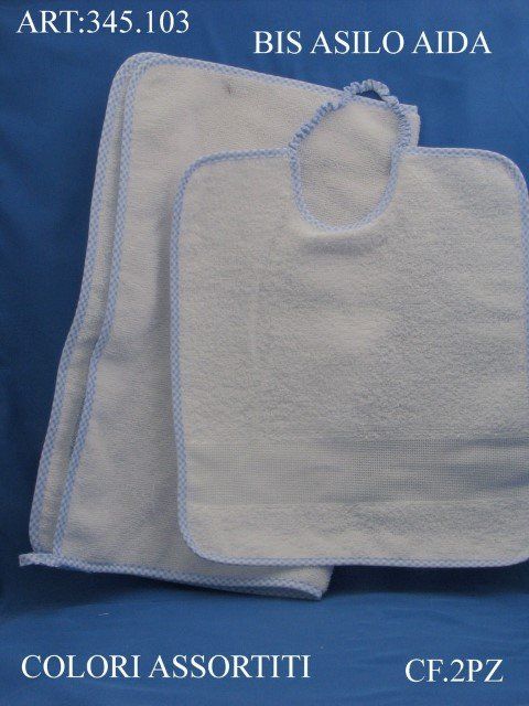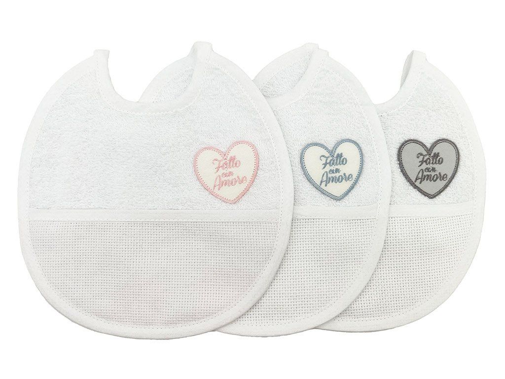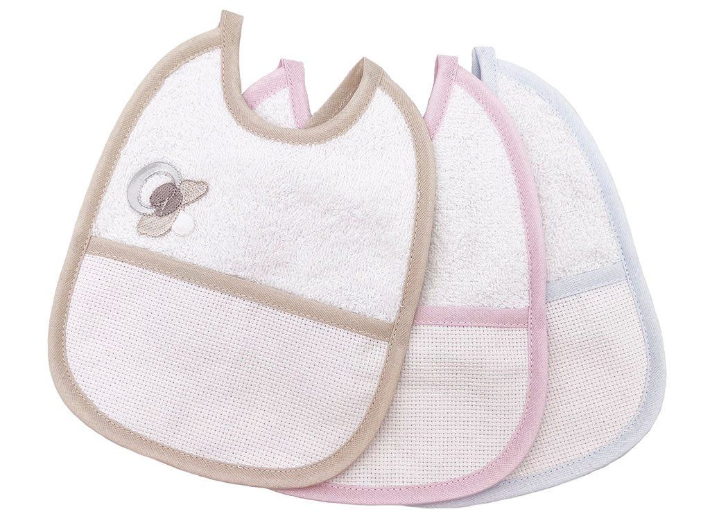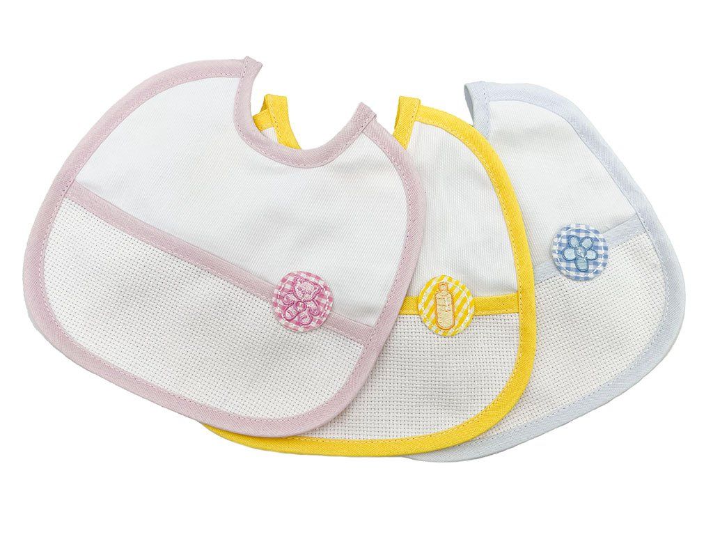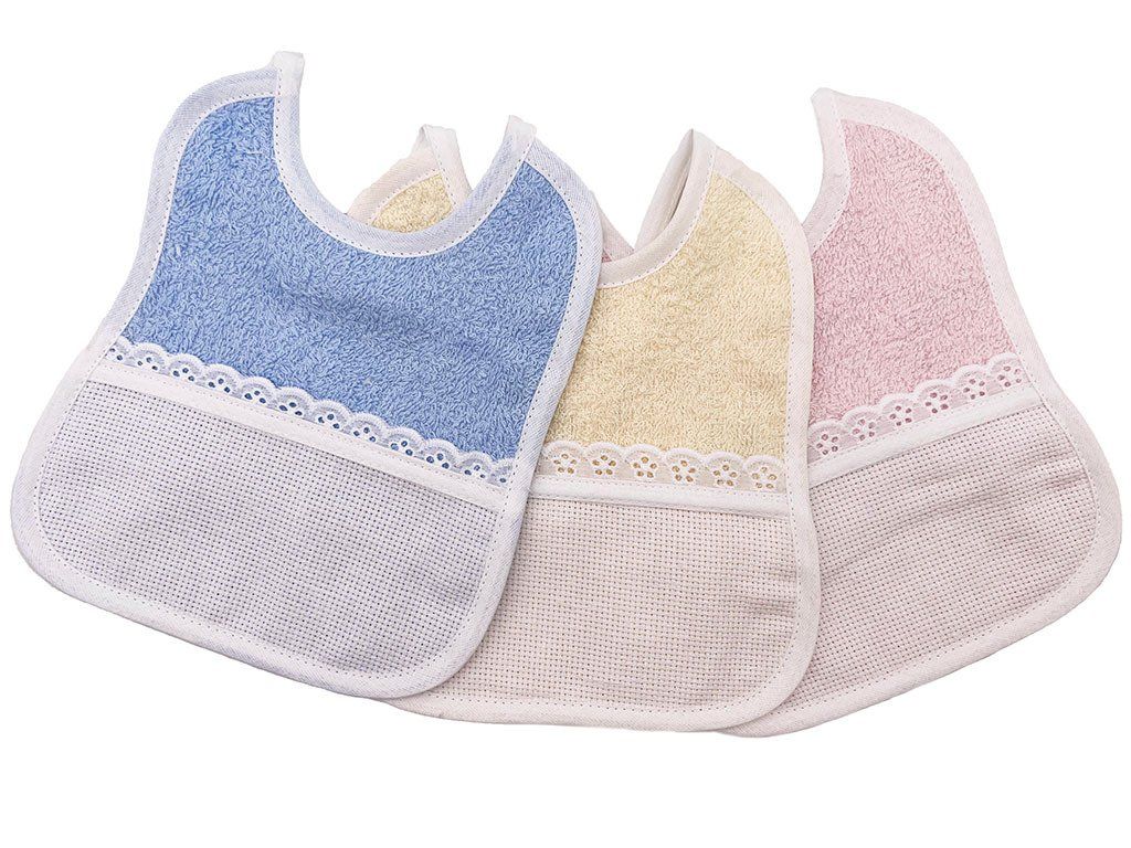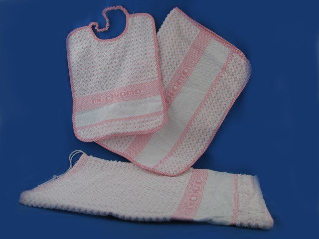Coordinati per asilo in spugna e tela di puro cotone con tela aida per ricamare composti da sacchetto, bavaglino, bustina ed asciugamano.