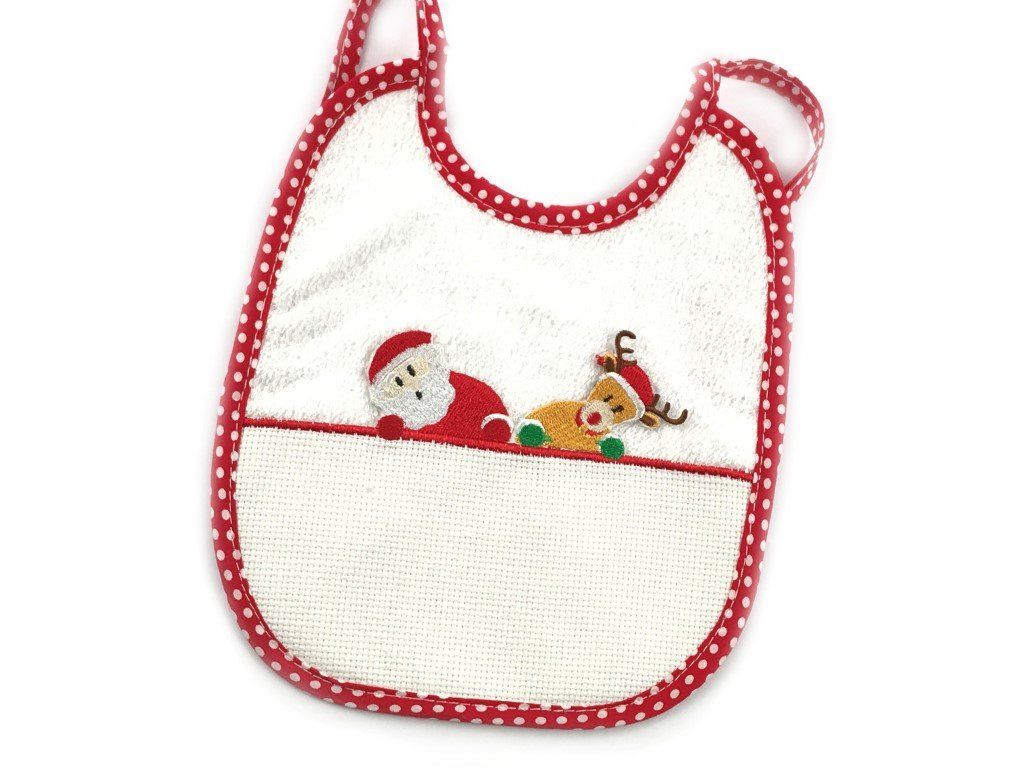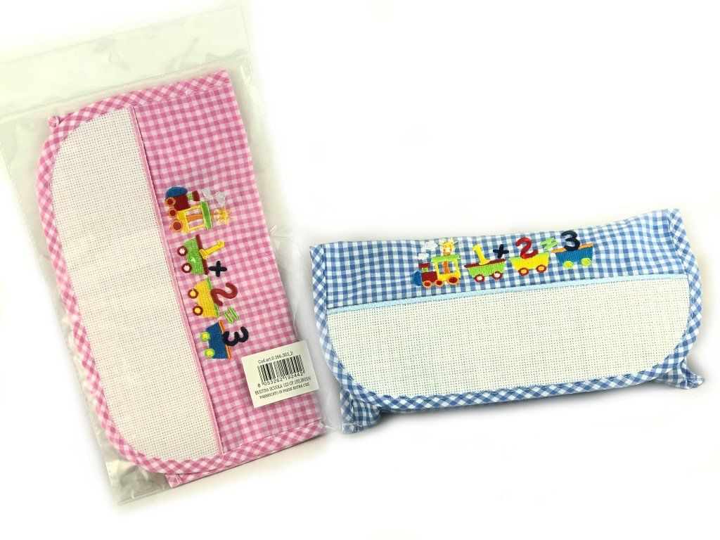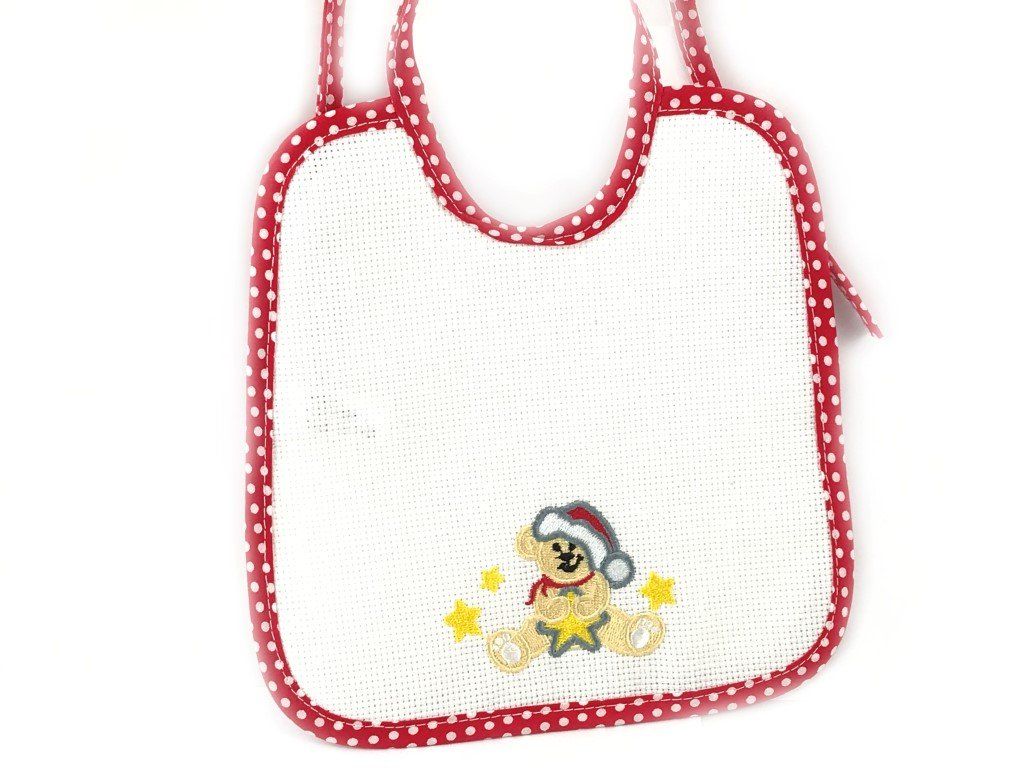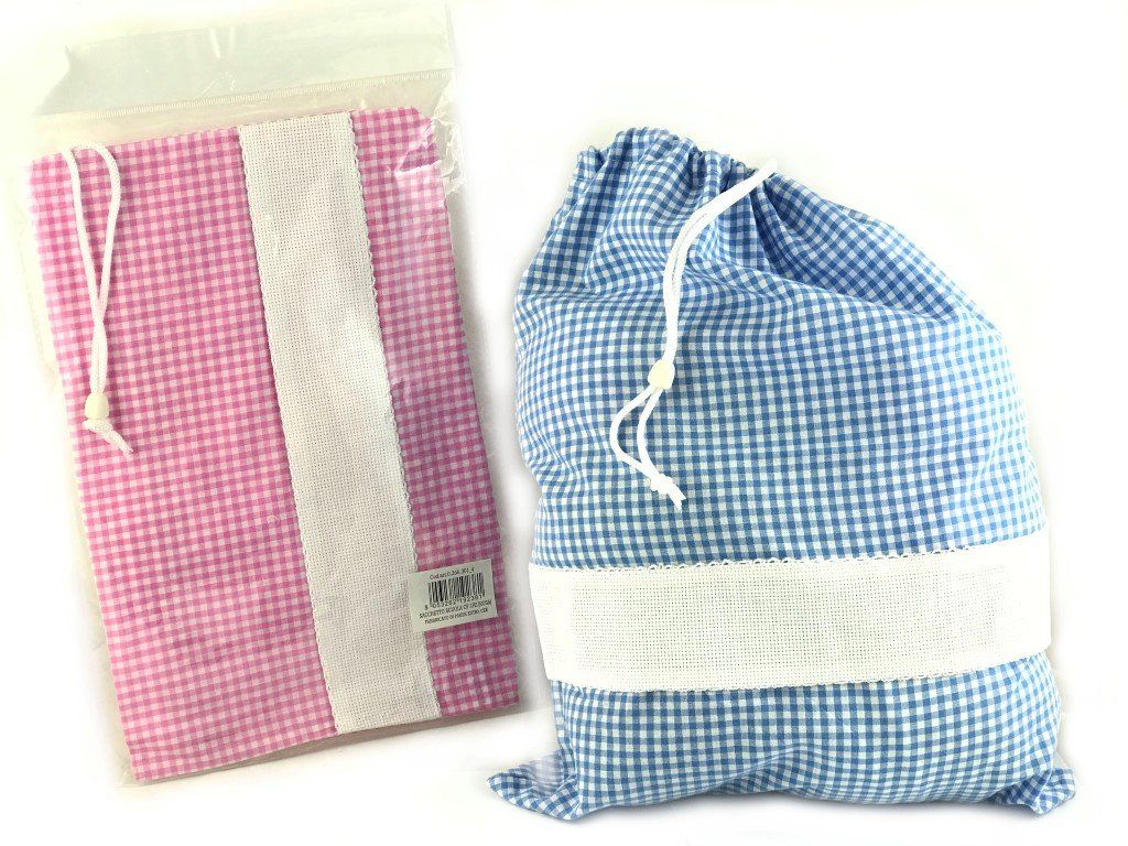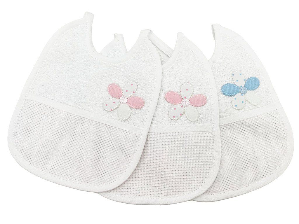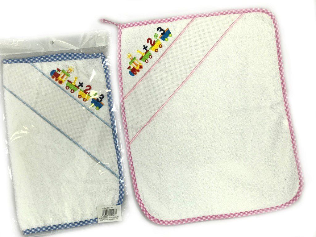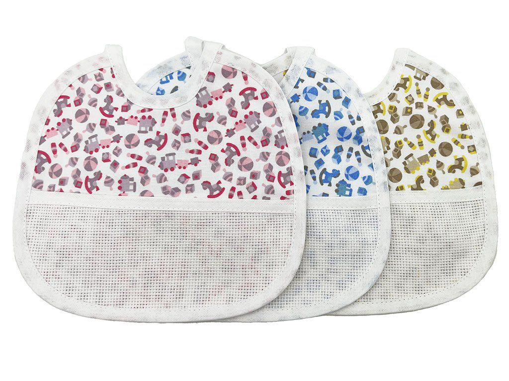 Coordinati per asilo in spugna e tela di puro cotone con tela aida per ricamare composti da sacchetto, bavaglino, bustina ed asciugamano.