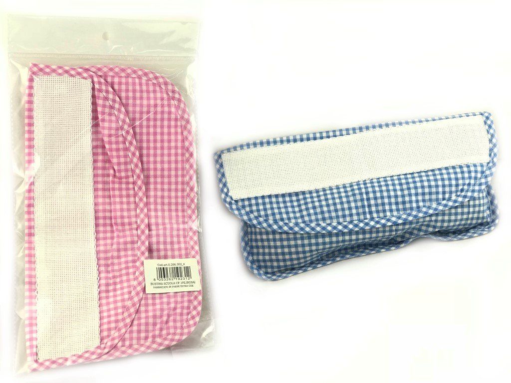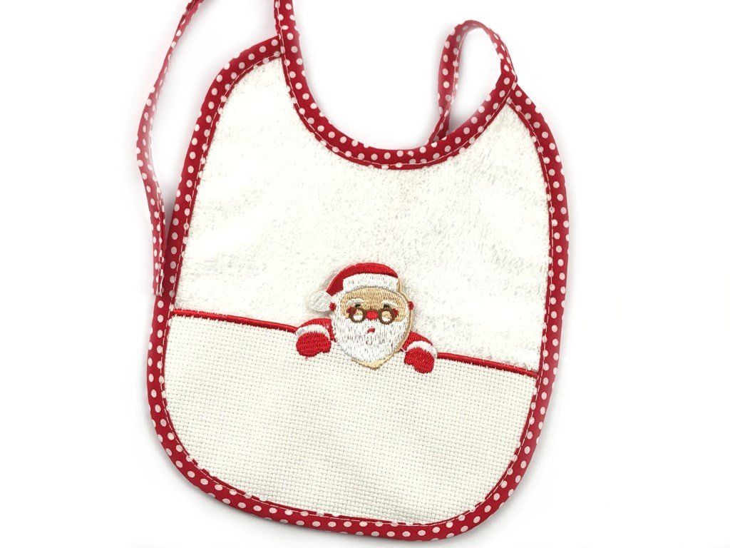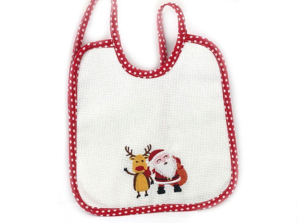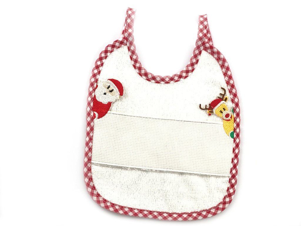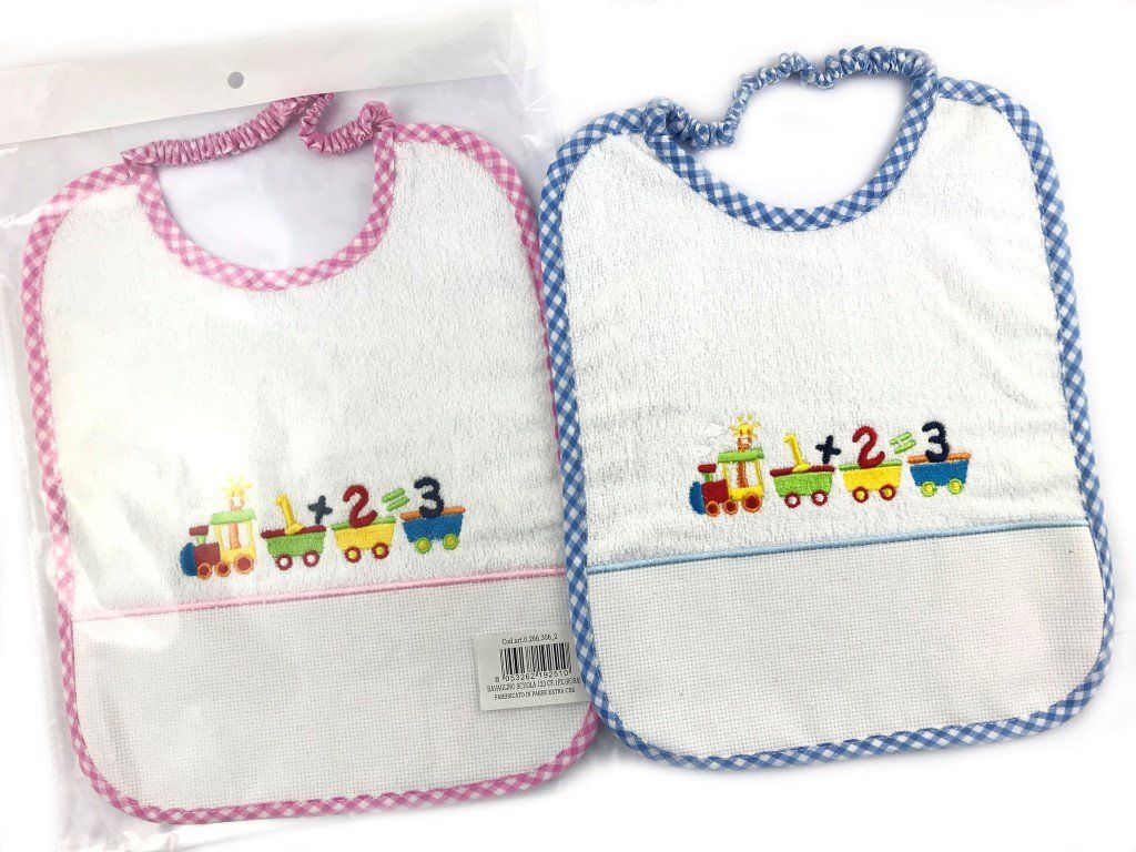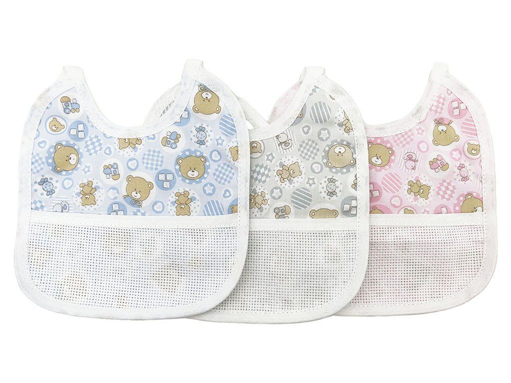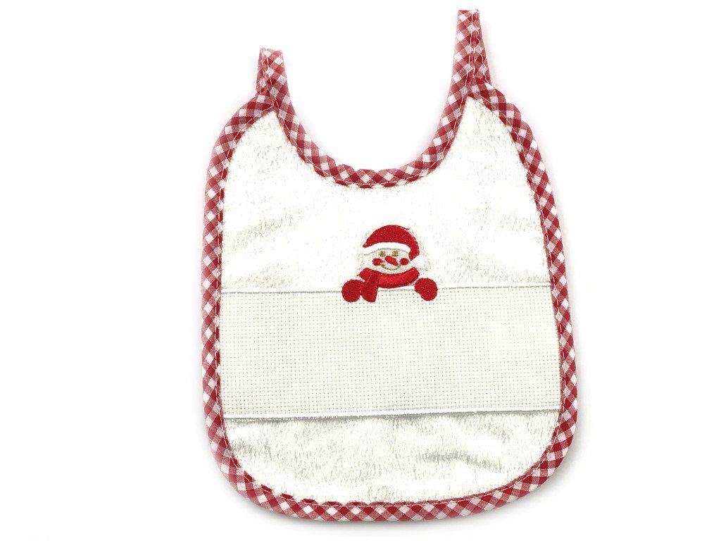 Coordinati per asilo in spugna e tela di puro cotone con tela aida per ricamare composti da sacchetto, bavaglino, bustina ed asciugamano.