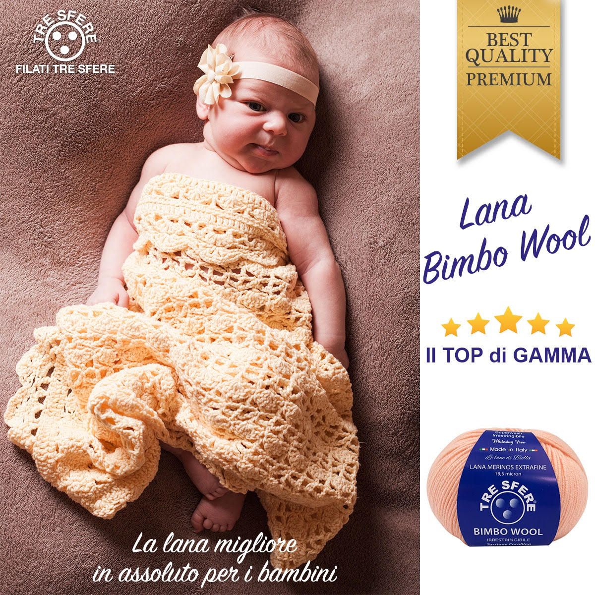 Lana Baby, 100% pura lana vergine merino extrafine 19 micron, certificata mulesing free, torsione corallina mille fili, irrestringibile, made in Italy, prodotto pettinato filato ritorto tinto e confezionato interamente in Italia a Biella, peso garantito, confezione da 10 gomitoli da 50 grammi, un gomitolo sviluppa 145 metri, si lavora con ferri 3-3.5 Articolo prodotto sotto controllo Filati Tre Sfere rispettando tutte le normative internazionali di qualità.